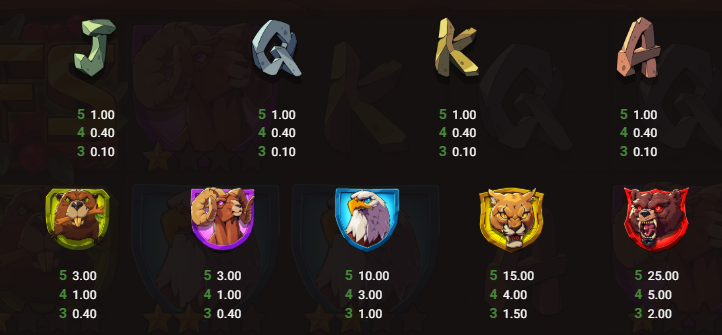 The game includes 14 symbols in total. Low-value symbols are represented by card ranks (J, Q, K, and A), while premium symbols feature wildlife such as beavers, elks, eagles, mountain lions, and bears. The Wild is the highest-paying symbol, awarding up to 25x for five of a kind and substituting for all regular symbols. Additional special symbols include Scatters, Hunting Season symbols, Trap Collect symbols, and Money symbols (Bronze, Silver, Gold, and Diamond).