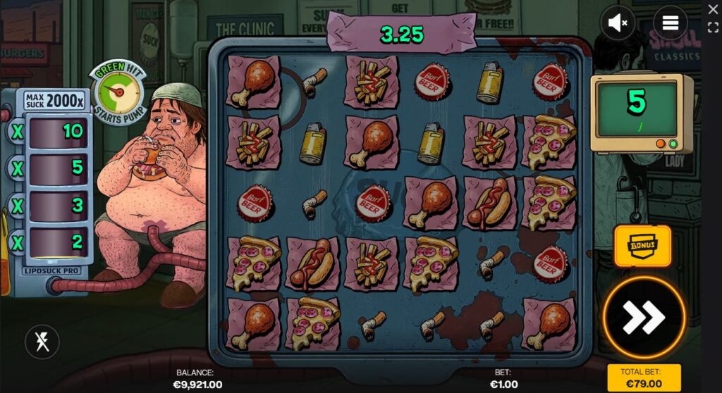 The Bonus is triggered by landing three Scatter symbols and awards six free spins. During the feature, the LipoSuck Pro Pump becomes active. After each spin, a gauge determines whether the pump activates. If it does, the pump advances to a random level and applies a corresponding multiplier to that spin’s win. The pump has four base levels with multipliers of 2x, 3x, 5x, and 10x, which can be upgraded when a Multiplier Upgrade symbol lands. Each level has a maximum cap, and once reached it cannot be increased further. Extra Spin symbols can award additional free spins, while Gauge Upgrade symbols expand the activation area, making pump triggers more likely.